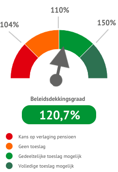 De dekkingsgraad is een percentage. Het geeft de verhouding aan tussen het kapitaal dat ons pensioenfonds bezit en het kapitaal dat ons pensioenfonds nodig heeft om nu en in de toekomst alle (opgebouwde) pensioenen te kunnen uitbetalen (= verplichtingen). Bij een dekkingsgraad van 105% heeft ons pensioenfonds €1,05 in kas voor elke euro die we aan pensioen moet uitkeren.