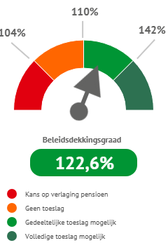 De daling van ons vermogen en de daling van de rente zorgden voor een daling van onze actuele dekkingsgraad met 1,4%-punt naar 122,8%.