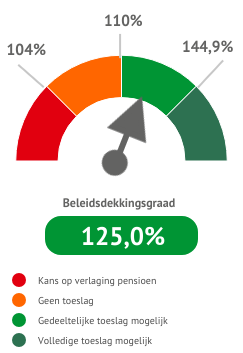 De beleidsdekkingsgraad steeg met 0,7%-punt. Dit komt doordat de dekkingsgraad van september 2024 (122,9%) is vervangen door de hogere dekkingsgraad van september 2025 (131,6%) in het 12-maandelijks gemiddelde.